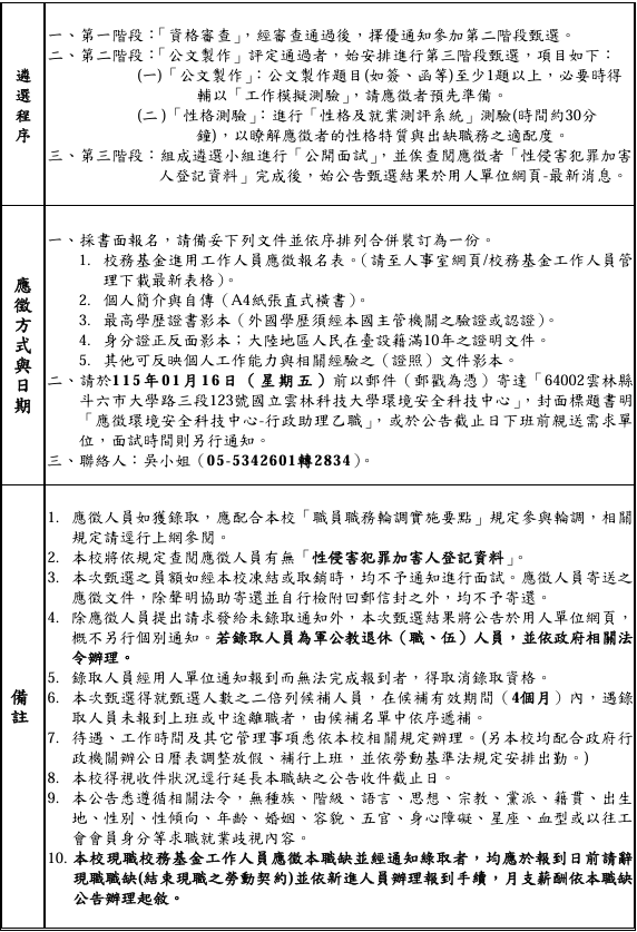 【徵才】環科中心-安全衛生組誠徵行政助理(職護)1名〔延長收件至115/01/16〕